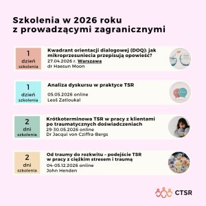 Centrum Terapii Skoncentrowanej na Rozwiązaniach CTSR jest placówką szkoleniowo-rozwojową istniejącą od ponad 21 lat. Jej celem jest rozwój i wdrażanie metod podejścia skoncentrowanego na rozwiązaniach w różnych obszarach życia, w tym w pracy terapeutycznej oraz pomocy psychologicznej. Nasz Ośrodek Szkoleniowy posiada akredytację PSTTSR.